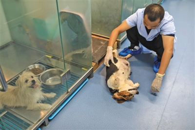 一只马上就要生产的代孕母狗正在被工作人员抚摸。记者 浦峰