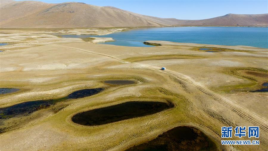 快递车将网购的商品送到新疆青河县查干郭勒乡萨尔布拉克村的牧场(2018年8月24日无人机拍摄)。 新华社记者江文耀摄