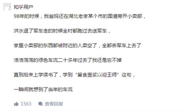 一个网友这样回答:2002年的暑假,我还是个军校生,刚上完了大二。那年暑假是在武汉上游长江大堤上面度过的,作为抗洪战备部队。帐篷门口挂着一个横幅:“严防死守,滴水不漏”。队长说,多扛一个沙袋,大堤就安全了一分,而大堤后面是千家万户的安居乐业,作为一个战士你没有资格去顾自己、顾战友。他站在我们面前,挥着手伸出一根食指,指着我们脚下的大堤,斩钉截铁地说:“死也得死在大堤上!”