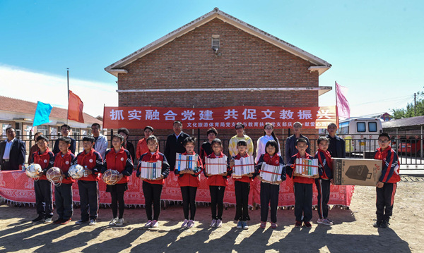 图为翁牛特旗脱贫攻坚联合党委的教育扶贫党支部和文体旅游党支部携手到紫城街道杨家营子小学开展联合式主题党日活动。