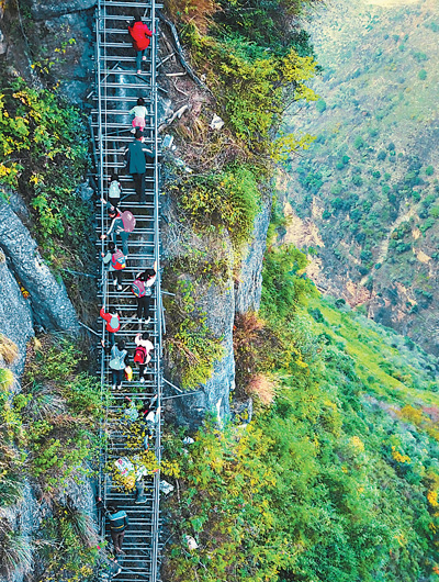 当地学生攀登最后两段垂直高度100多米的钢梯。陈杰摄(影像中国)