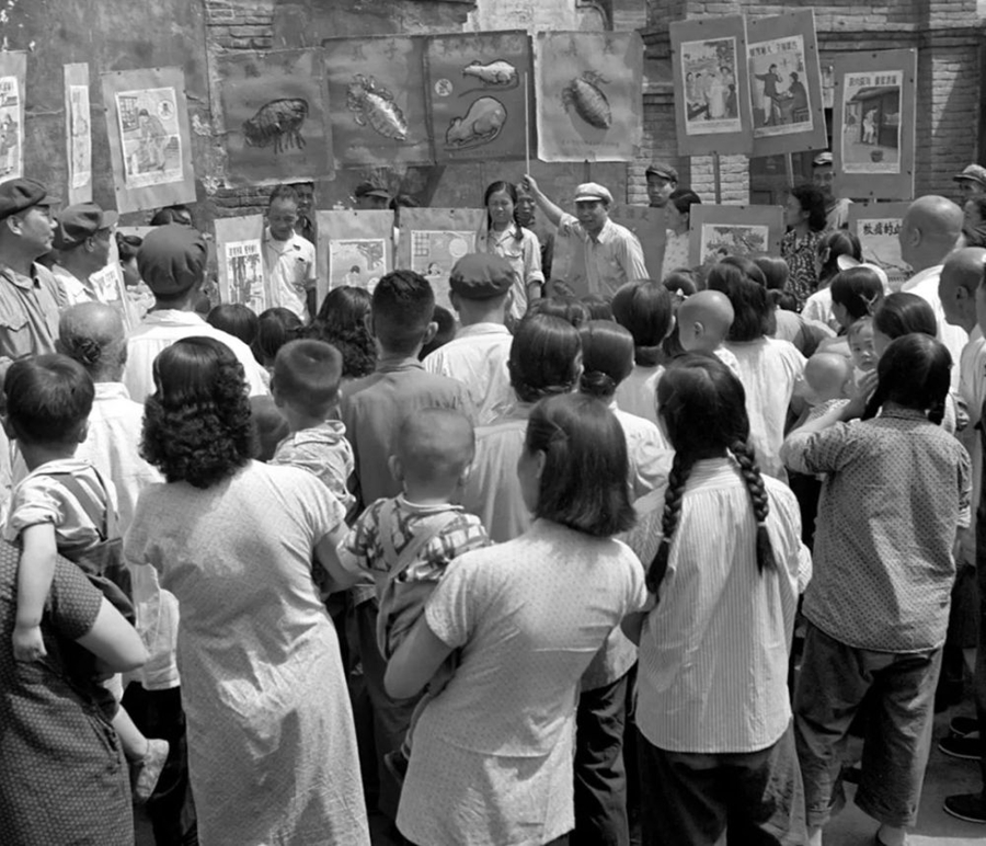 1953年6月,北京前炒面胡同爱国卫生运动委员会分会宣传队正在向群众讲解蚊、蝇怎样传染疾病。(新华社记者毛松友 摄)