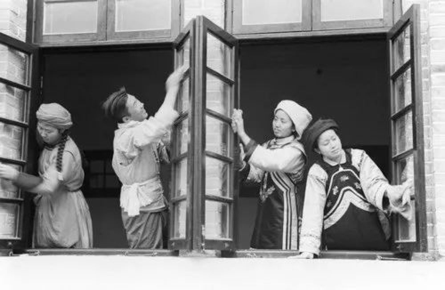 1952年7月31日,西南民族学院的师生开展校舍和个人清洁卫生活动(新华社记者孙忠靖 摄)