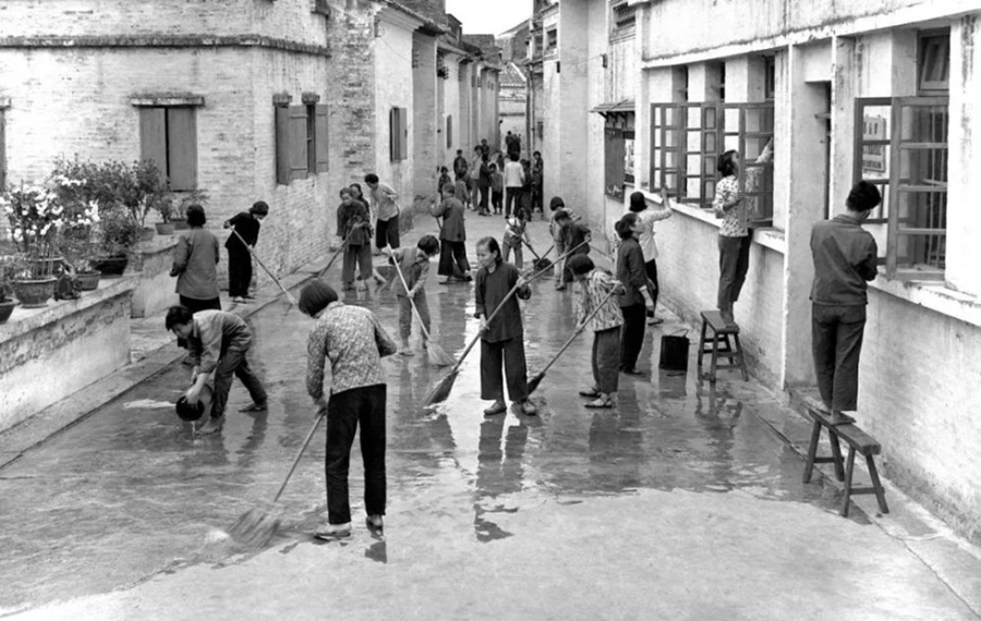 1966年1月17日,全国卫生红旗单位广东省佛山市在春节前夕,又掀起一个爱国卫生运动的高潮。图为佛山市滘边街居民在洗刷街道。(新华社记者李开远 摄)
