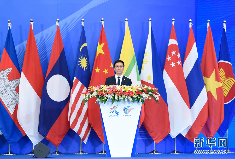 9月21日,第十六届中国-东盟博览会和中国-东盟商务与投资峰会在广西南宁开幕。中共中央政治局常委、国务院副总理韩正出席开幕式并发表主旨演讲。 新华社记者 申宏 摄