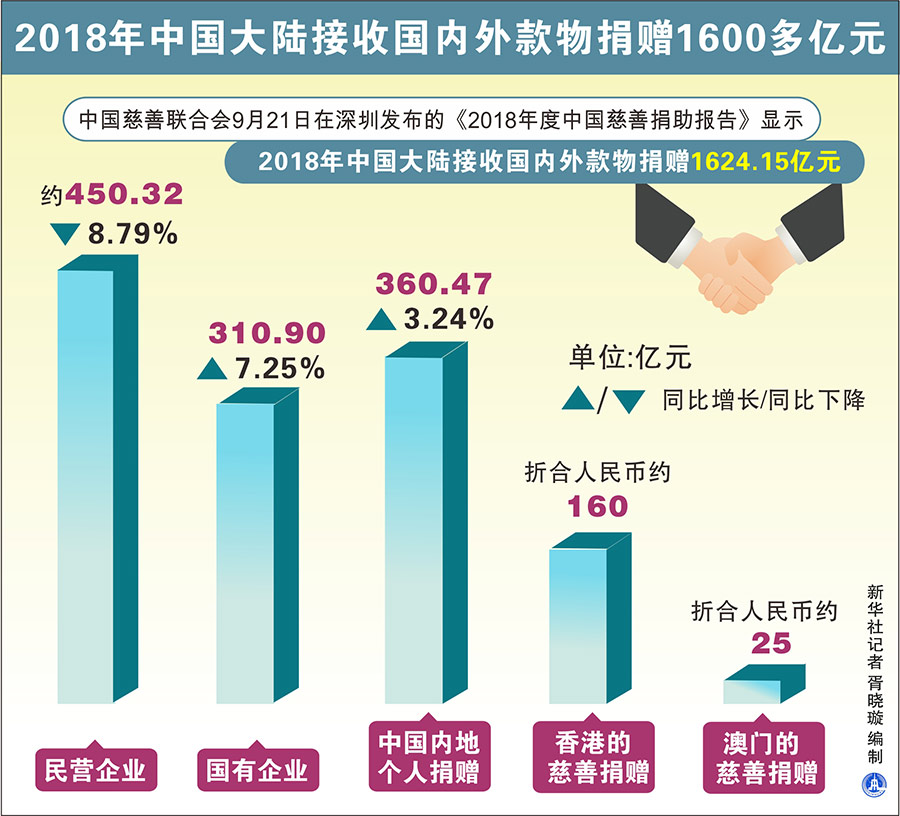 新华社深圳9月21日电(记者王丰、李晓玲)中国慈善联合会21日在深圳发布的《2018年度中国慈善捐助报告》显示,2018年中国大陆接收国内外款物捐赠1624.15亿元。
