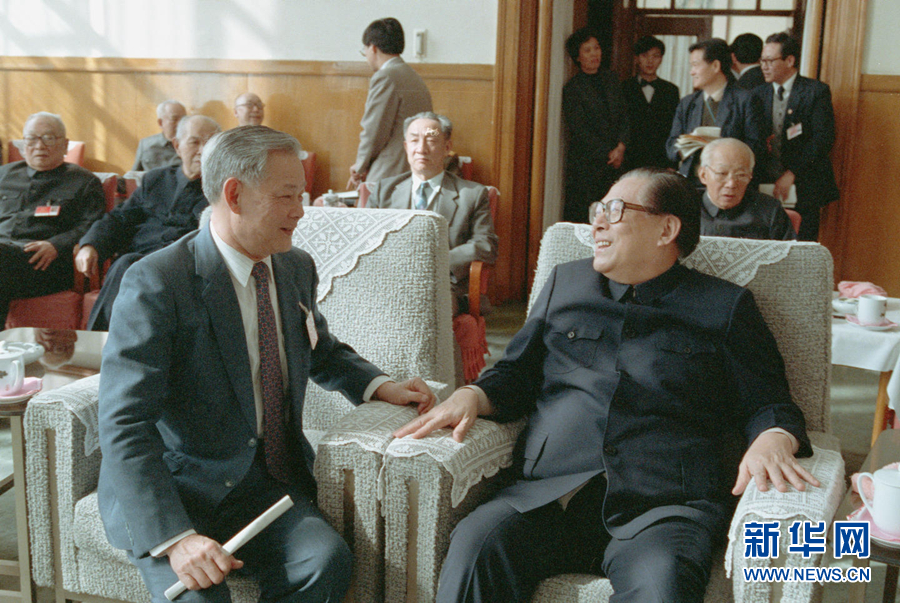 1992年3月28日,全国政协七届五次会议在北京人民大会堂闭幕。这是江泽民同志与叶选平同志在休息室交谈。 新华社记者 王新庆 摄