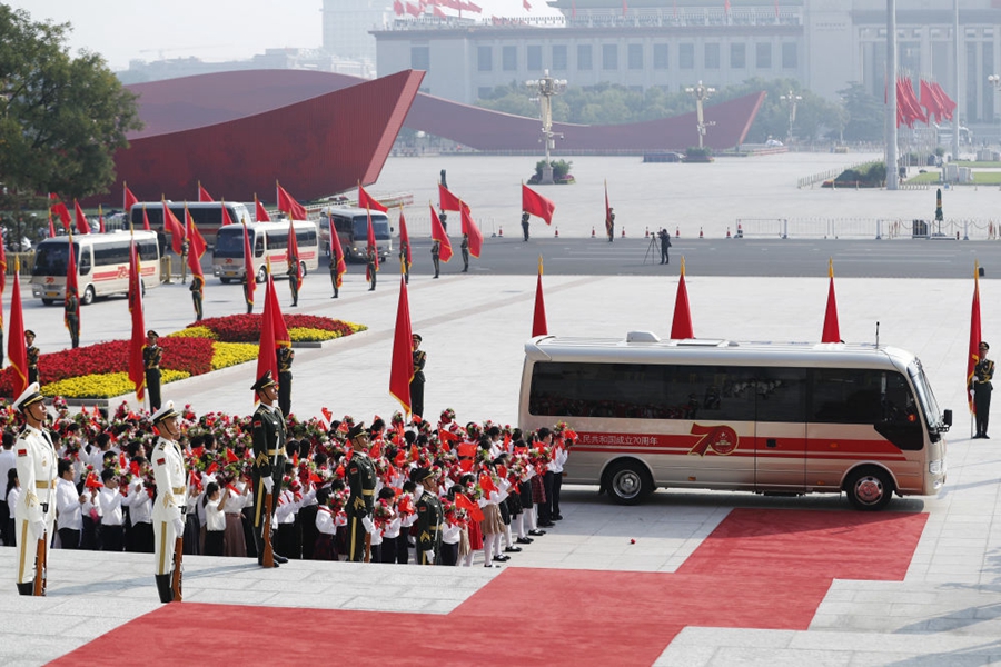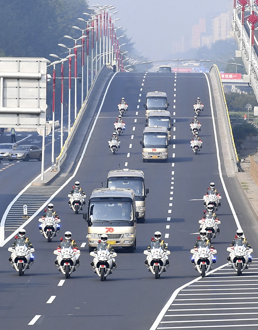 29日上午,国家勋章和国家荣誉称号获得者集体乘坐礼宾车从住地出发,在英姿飒爽的国宾护卫队护卫下,汇成一列车队,向人民大会堂进发。