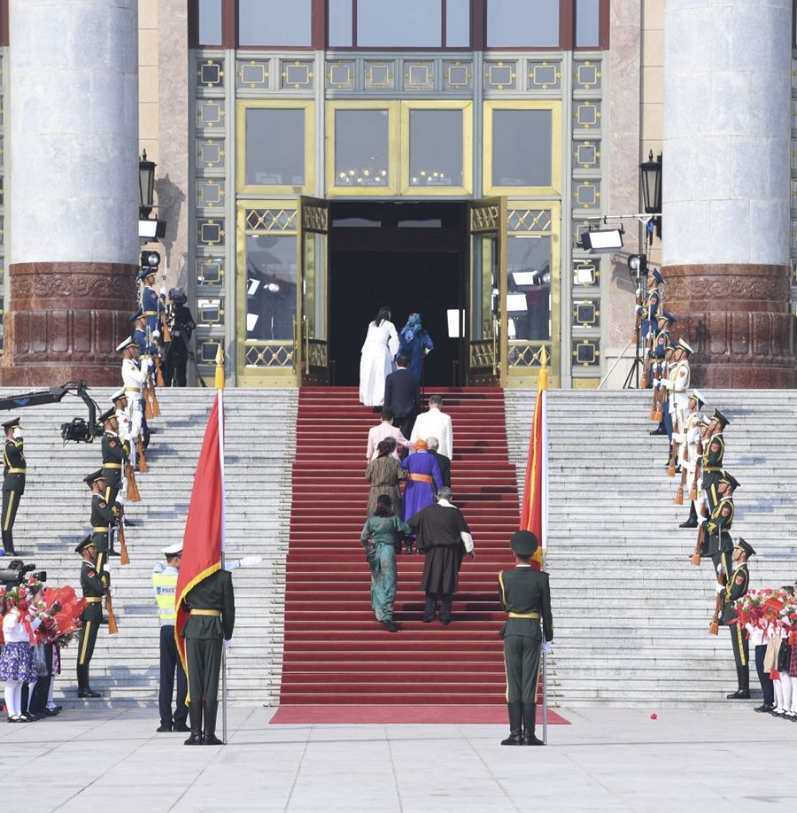人民大会堂东门外,高擎红旗的礼兵分列道路两侧,肩枪礼兵在台阶上庄严伫立。车队抵达时,早已迎候在这里的青少年们迸发出热情的欢呼。