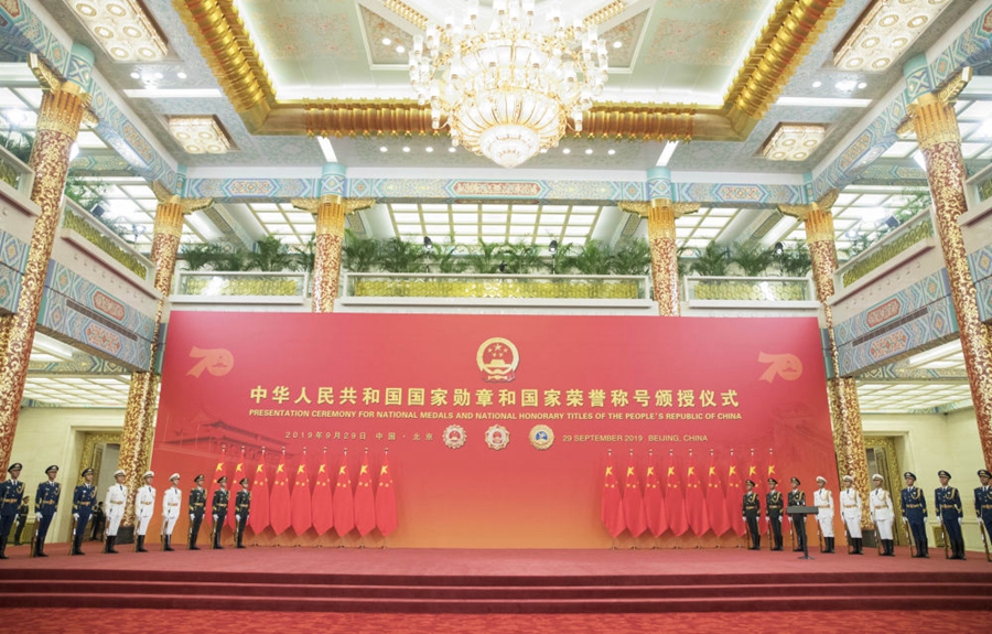 国家勋章和国家荣誉称号颁授仪式29日上午在北京人民大会堂金色大厅隆重举行。
