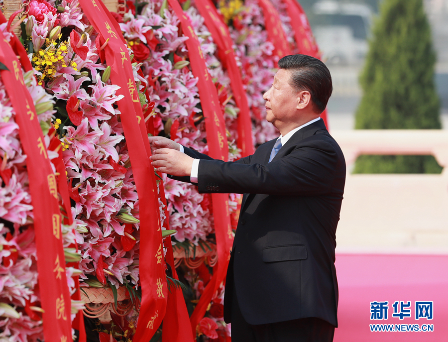 9月30日上午,习近平、李克强、栗战书、汪洋、王沪宁、赵乐际、韩正、王岐山等党和国家领导人来到北京天安门广场,出席烈士纪念日向人民英雄敬献花篮仪式。这是习近平整理花篮上的缎带。 新华社记者 庞兴雷 摄