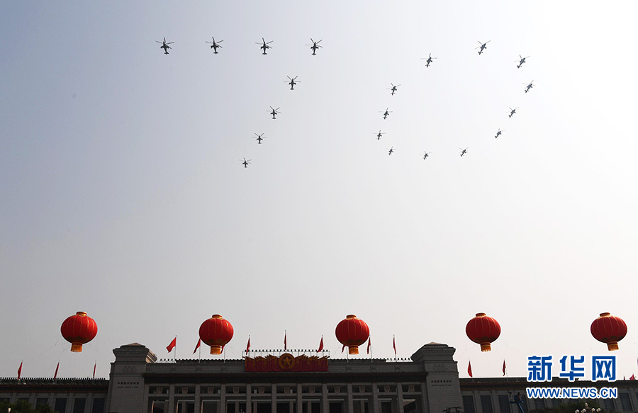 10时43分,3架载旗直升机依次飞过天安门广场上空,党旗、国旗、军旗迎风飘扬,紧随其后的20架直升机组成巨大“70”字样……