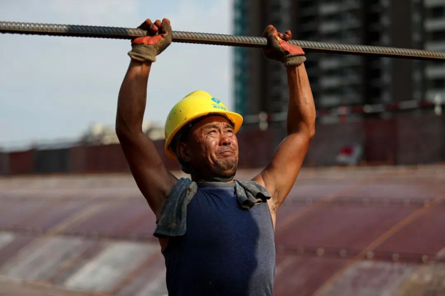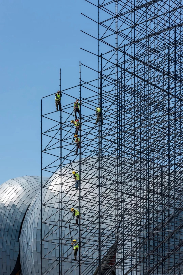 7月1日,山西大同。烈日下,数十米高的钢架上,工人们仍在奋战。作者:王京