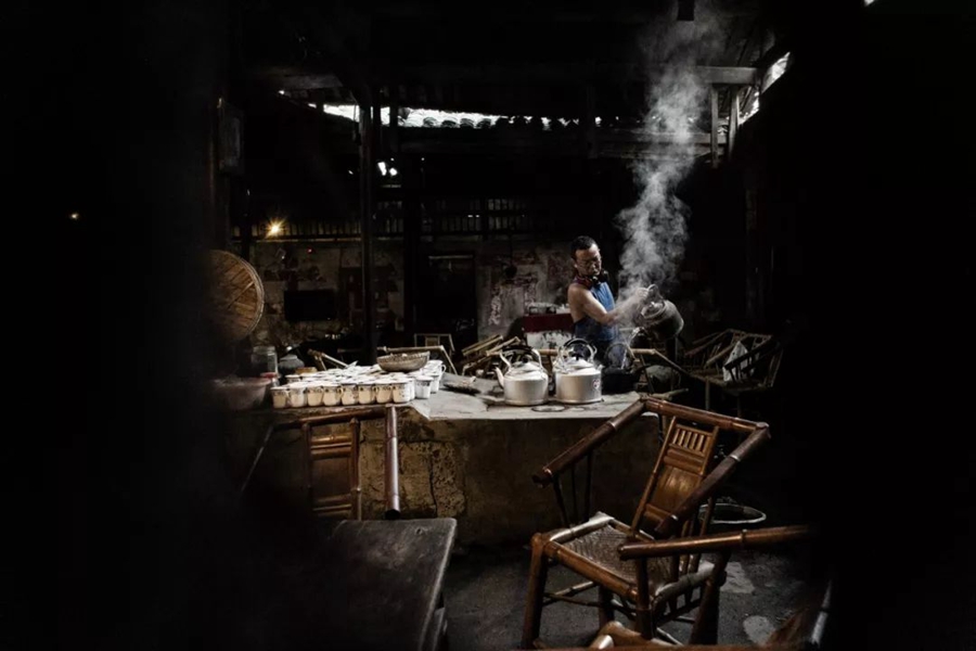 5月17日,四川成都。早晨,茶馆工作人员开始倒水。作者:王金磊