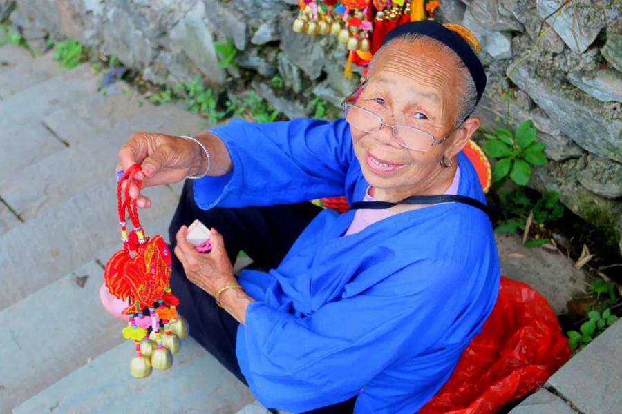 9月1日,广西桂林。一位在景区编织五彩铃的老奶奶。作者:zeus