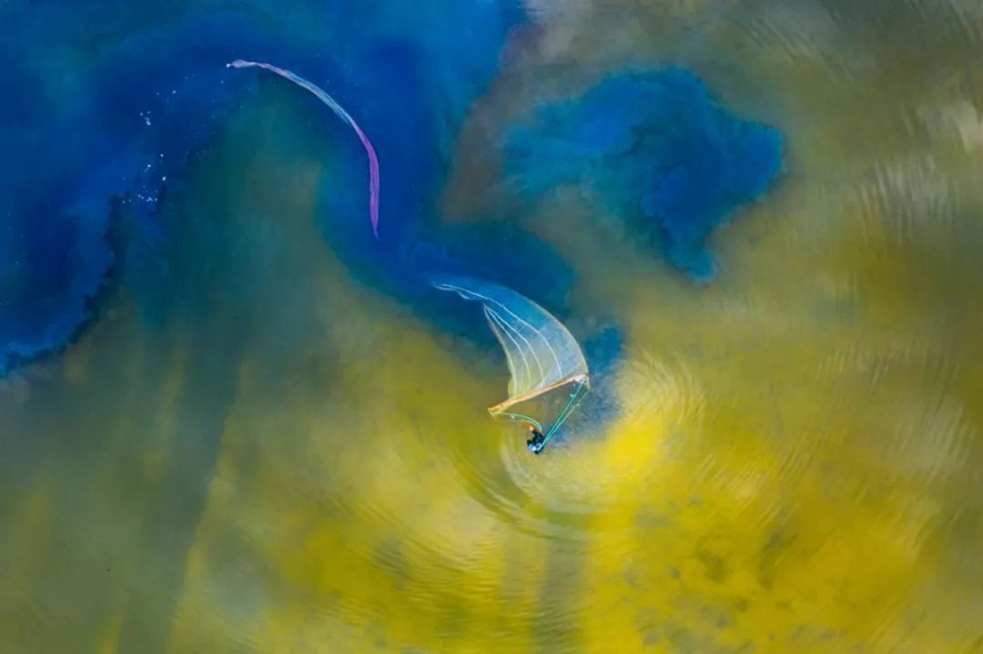 8月28日,山西运城。捞虫人在盐湖中捞盐水虫。作者:尚建周