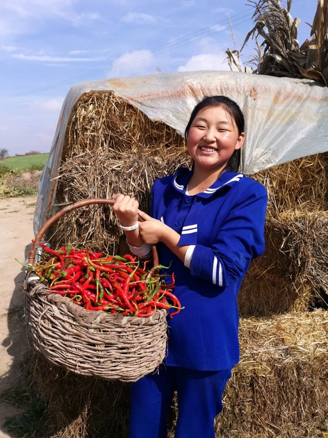 10月2日,甘肃平凉。女童提着刚采摘的辣椒,喜上眉梢。作者:花青