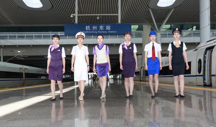 10月2日,浙江杭州。杭州客运段列车员穿上不同的铁路制服。作者:沈克勤