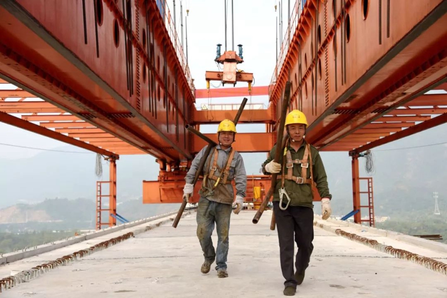 9月30日,浙江仙居。建设者们在台金铁路永安溪特大桥上施工。作者:王华斌