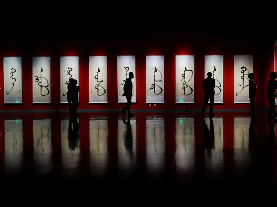 2019年9月15日,内蒙古呼和浩特。蒙古文字书法“绿水青山就是金山银山”吸引人们驻足观看。作者:刘涛