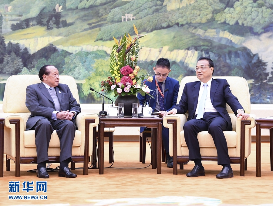 10月9日,国务院总理李克强在北京人民大会堂会见来华出席2019年中国北京世界园艺博览会闭幕式的柬埔寨副首相贺南洪。 新华社记者 燕雁摄