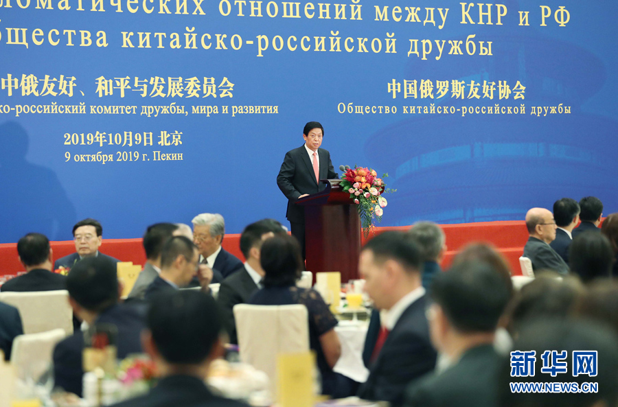 10月9日,全国对外友协,中俄友好、和平与发展委员会,中俄友协在北京人民大会堂举行庆祝中俄建交暨中俄友协成立70周年招待会。中共中央政治局常委、全国人大常委会委员长栗战书出席并致辞。 新华社记者 刘卫兵 摄