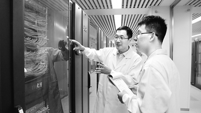 孟祥飞(左)和同事在检查“天河一号”的运行状况。资料图片