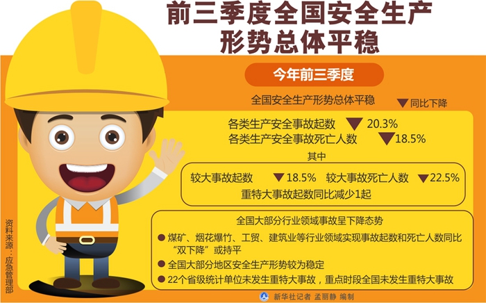 新华社北京10月12日电(记者魏玉坤)记者12日从应急管理部获悉,今年前三季度,全国安全生产形势总体平稳,各类生产安全事故起数和死亡人数同比分别下降20.3%和18.5%。其中,较大事故起数和死亡人数同比分别下降18.5%和22.5%,重特大事故起数同比减少1起。
