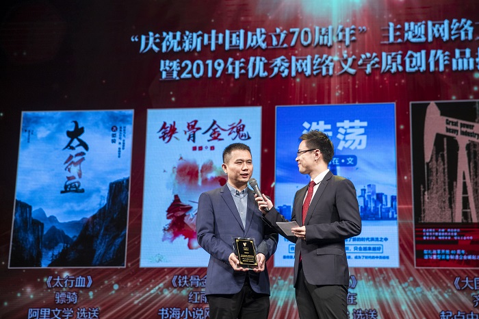 由国家新闻出版署和中国作家协会联合举办的“庆祝新中国成立70周年”暨2019年优秀网络文学原创作品推介活动发布仪式11日在京举行。《大江东去》《繁花》《致我们终将逝去的青春》《浩荡》《宛平城下》《传国功匠》等25部作品获推介。新华网 郭小天摄