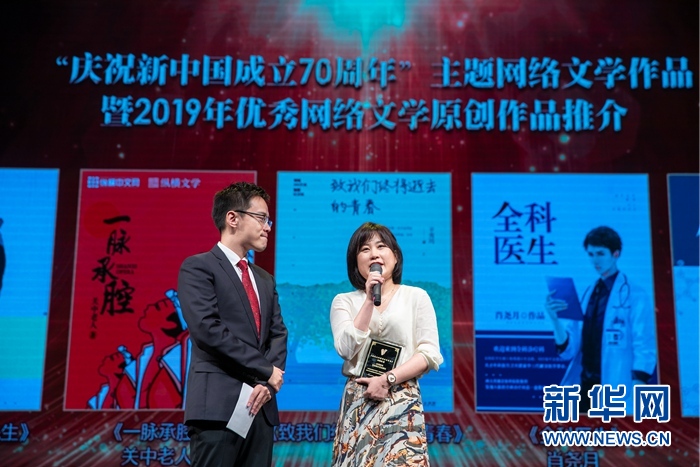 由国家新闻出版署和中国作家协会联合举办的“庆祝新中国成立70周年”暨2019年优秀网络文学原创作品推介活动发布仪式11日在京举行。《大江东去》《繁花》《致我们终将逝去的青春》《浩荡》《宛平城下》《传国功匠》等25部作品获推介。新华网 郭小天摄