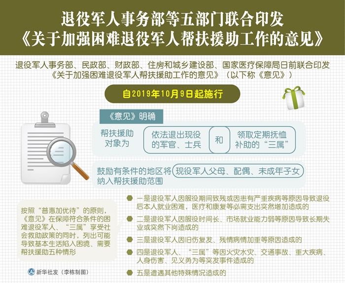 新华社北京10月21日电(记者梅世雄)退役军人事务部、民政部、财政部、住房和城乡建设部、国家医疗保障局日前联合印发《关于加强困难退役军人帮扶援助工作的意见》(以下称《意见》),自2019年10月9日起施行。