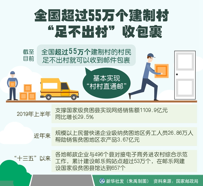新华社北京10月23日电(记者 赵文君)“双11”快递旺季即将到来,记者23日从国家邮政局获悉,截至目前,全国超过55万个建制村的村民足不出村就可以收到邮件包裹,基本实现“村村直通邮”。邮政、快递成为农产品上行的重要力量,农村寄递实现了从“寄包裹”到“产包裹”的转变,真正搞活了农产品流通。