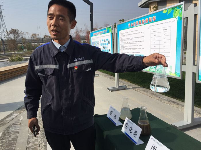 图为延庆城西再生水厂副总经理王国荣向记者介绍再生水的处理流程 新华网 王莹 摄