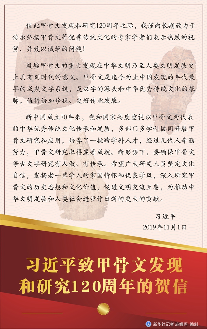 习近平致甲骨文发现和研究120周年的贺信 新华社记者 施鳗珂 编制