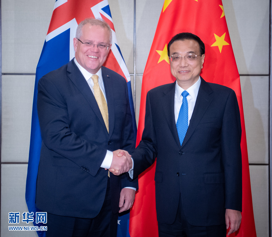 当地时间11月3日下午,国务院总理李克强在曼谷出席东亚合作领导人系列会议期间,同澳大利亚总理莫里森举行第七轮中澳总理年度会晤。 新华社记者翟健岚摄