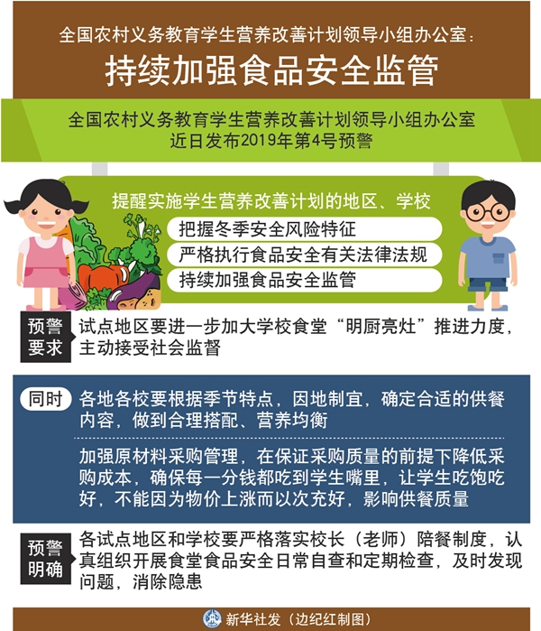 新华社北京11月5日电(记者施雨岑)全国农村义务教育学生营养改善计划领导小组办公室近日发布2019年第4号预警,提醒实施学生营养改善计划的地区、学校把握冬季安全风险特征,严格执行食品安全有关法律法规,持续加强食品安全监管。