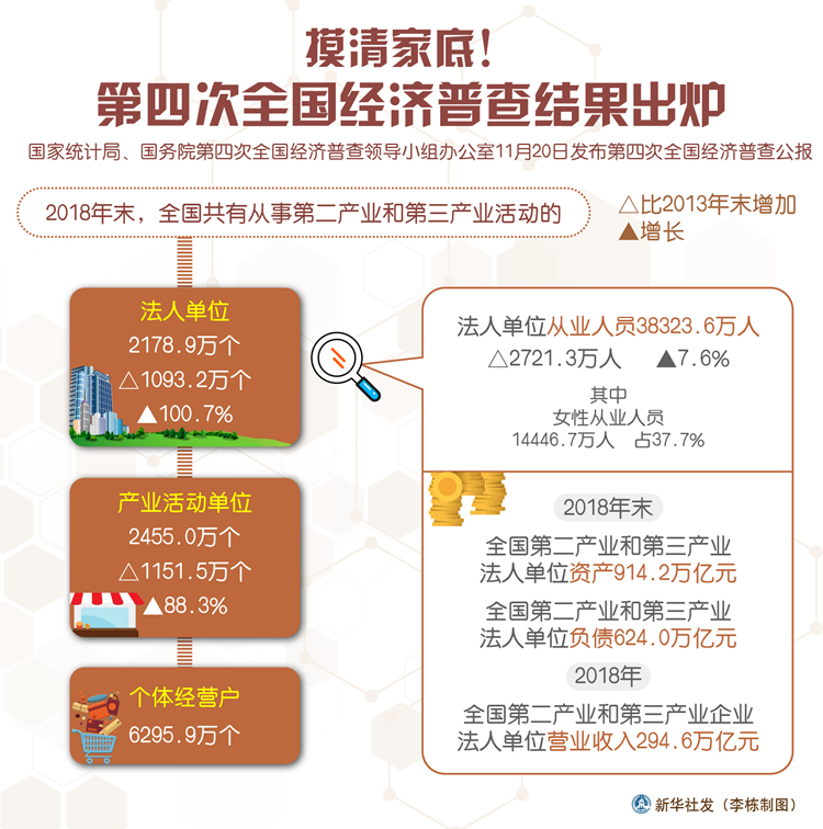 第四次全国经济普查主要数据20日正式公布。此次普查摸清了我国第二产业和第三产业家底,是对国民经济的一次全面“体检”。普查结果也反映出经济结构、市场活力、创新动力等方面的积极变化,勾勒中国经济新图景。