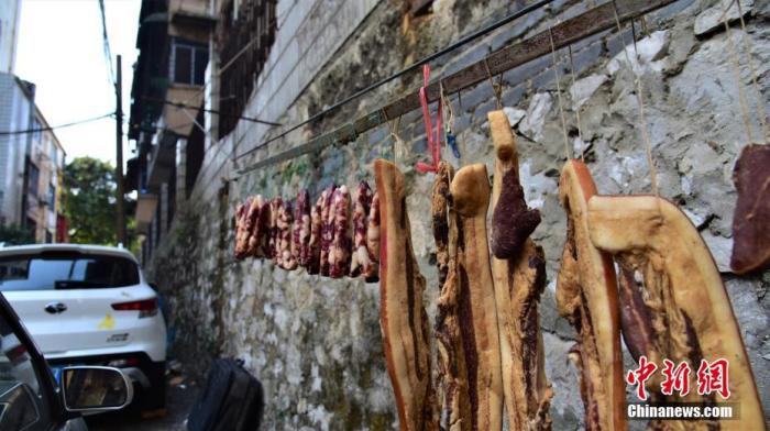 资料图:居民直接把腊肉和腊肠挂在路边停车位的旁边。王以照 摄