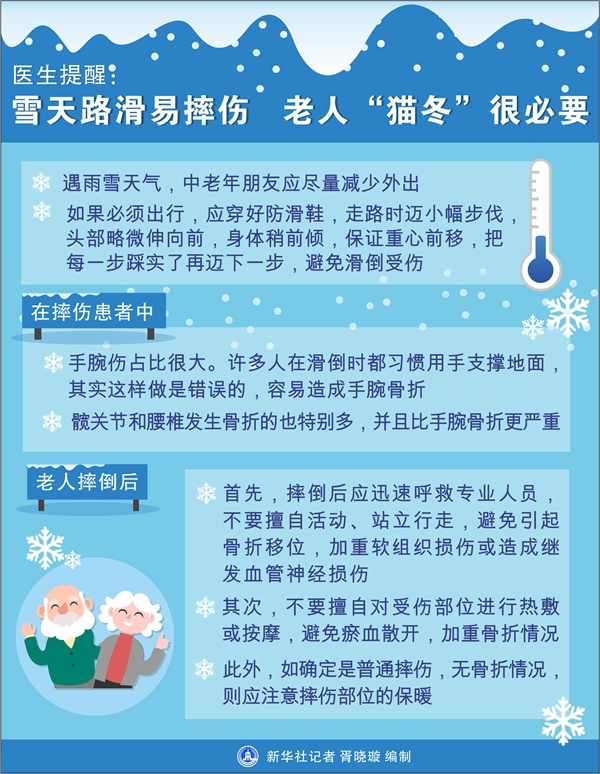 新华社长春11月24日电(记者赵丹丹)长春近日频繁降雪,路面十分湿滑,因摔倒而骨折、受伤的老人不少。医生提醒:遇雨雪天气,中老年朋友应尽量减少外出。如果必须出行,应穿好防滑鞋,走路时迈小幅步伐,头部略微伸向前,身体稍前倾,保证重心前移,把每一步踩实了再迈下一步,避免滑倒受伤。