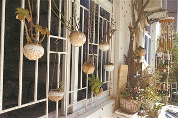 赵静家窗户上挂着的花盆是用椰子壳做成的。记者 刘友婷 摄