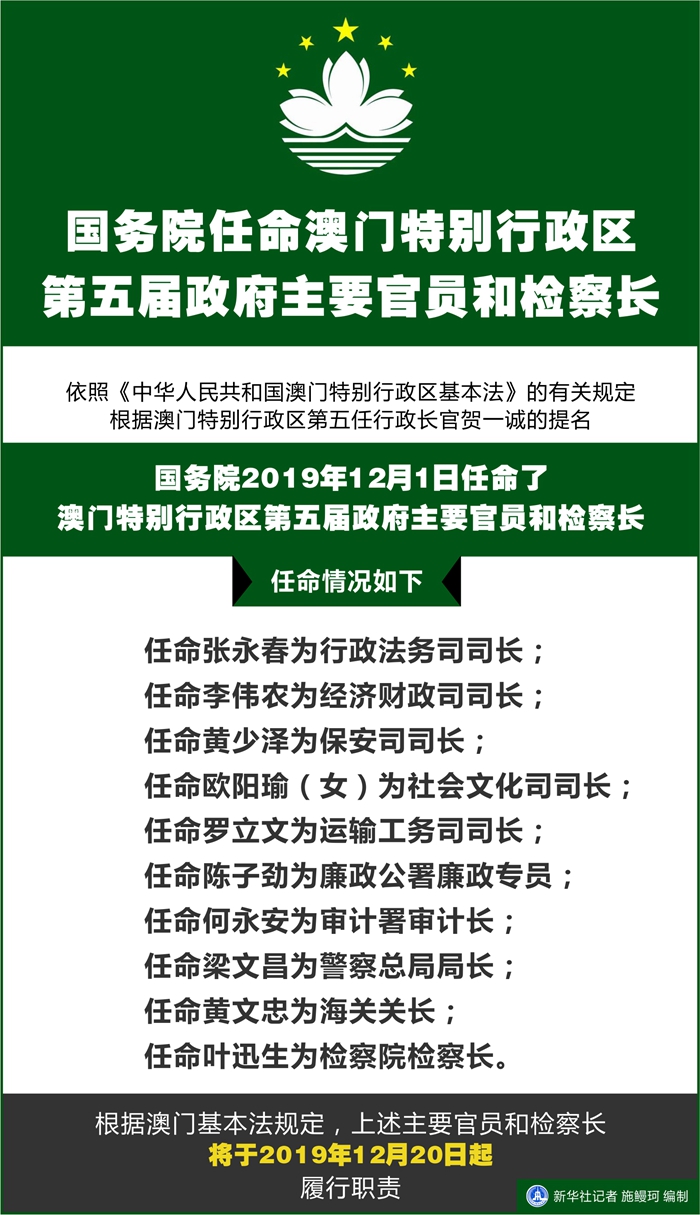新华社北京12月1日电 依照《中华人民共和国澳门特别行政区基本法》的有关规定,根据澳门特别行政区第五任行政长官贺一诚的提名,国务院2019年12月1日任命了澳门特别行政区第五届政府主要官员和检察长。任命情况如下: