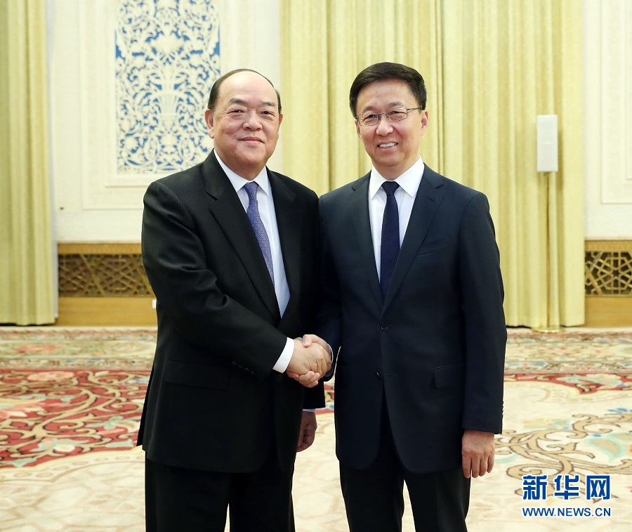 12月6日,中共中央政治局常委、国务院副总理韩正在北京人民大会堂会见澳门特别行政区候任行政长官贺一诚率领的来京接受任前培训的新一届政府管治团队。 新华社记者刘卫兵摄