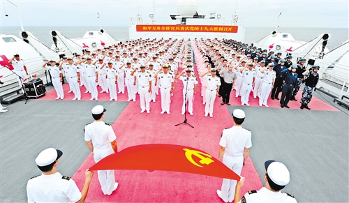 2017年10月18日,执行“和谐使命—2017”任务的中国海军和平方舟医院船在南大西洋举行重温入党誓词仪式,喜庆党的十九大胜利召开。江 山摄