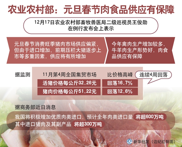 新华社北京12月17日电(于文静、许肖茜)农业农村部畜牧兽医局二级巡视员王俊勋17日表示,元旦春节消费旺季猪肉市场供应偏紧,但由于进口增加、前期压栏大猪逐步上市等多重因素,供应将有所增加。今年禽肉生产增加较多,牛羊肉生产形势好,肉食品供应有保障。