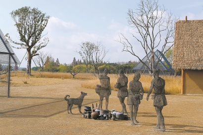 良渚古城遗址公园内一组反映先民日常生活的雕塑。