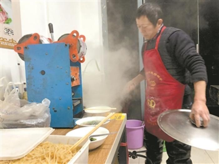 李芳萍与老公也来自安徽,开店卖板面已经超过3年。“咸菜又没了,再上一盆吧。”每天清晨,李芳萍的店里总会有人喊她补充咸菜。“我们腌了一些小咸菜免费供应。顾客说,我的咸菜比面还好吃,有的人就是冲这先到先得的咸菜才有了起床动力呢!”