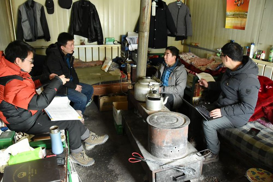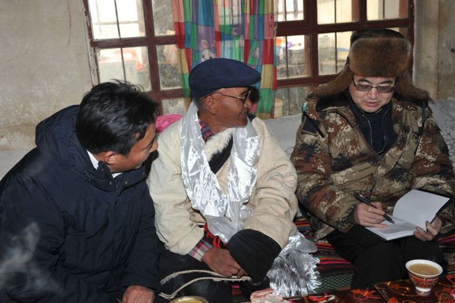 2019年1月29日,西藏分社副社长周健伟(右二)、张京品(右一)和白少波(左一)在那曲市安多县多玛乡采访基层干部。(洛桑云旦 摄)
