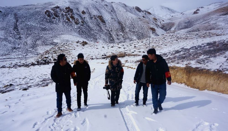 2019年1月8日,西藏分社记者陈尚才(左三)和楚鲁松杰乡干部在楚松村型钦牧场例行巡逻。(拉巴次仁 摄)