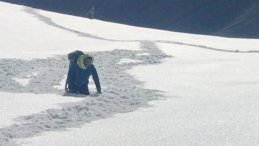 2017年6月27日,西藏分社记者索朗罗布在龙匣宰陇巴冰川雪地里爬行,雪下是冰河。(新华社记者薛文献 摄)