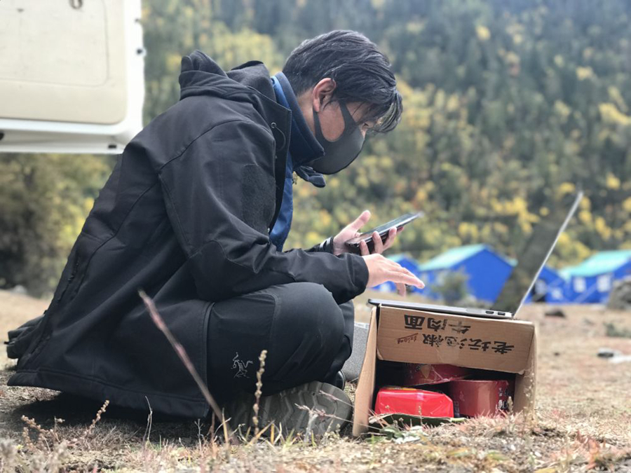 2018年10月22日,西藏分社记者普布扎西在雅鲁藏布江堰塞湖报道前线发稿。(昂翁彭措 摄)